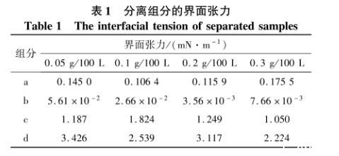 由表1可知,組分b質(zhì)量濃度達(dá)到0.2 g/100 L時,即可使該油/水體系的界面張力降至超低(低于10-3mN/m),而其他組分即使在較高質(zhì)量濃度的情況下,依然不能使其油/水體系的界面張力達(dá)到超低,其中組分d在降低該體系界面張力方面的能力最差。說明石油磺酸鹽活性組分的組成差異是影響系列石油磺酸鹽具有不同界面活性的主要因素。