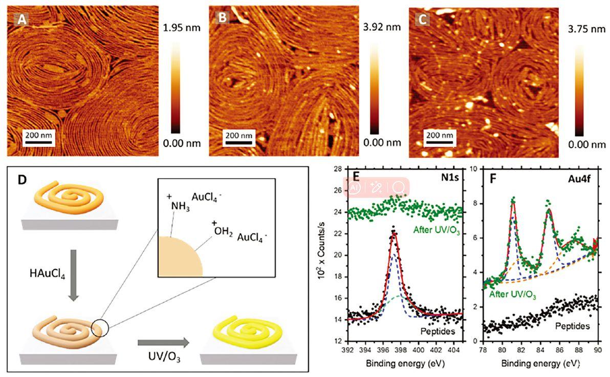 圖5、A)原始FP2肽在20 mN m-1表面壓力下在云母基底上的AFM顯微照片,B)浸入HAuCl4溶液30分鐘后的照片,以及C)在隨后的UV/O3降解處理后的照片。D)示意圖顯示了肽纖維和金前體鹽在水溶液中的相互作用。原始FP2肽的E)N 1s和F)Au 4f(黑點(diǎn))以及無(wú)機(jī)摻入和UV/O 3降解后(綠點(diǎn))的高分辨率XPS。