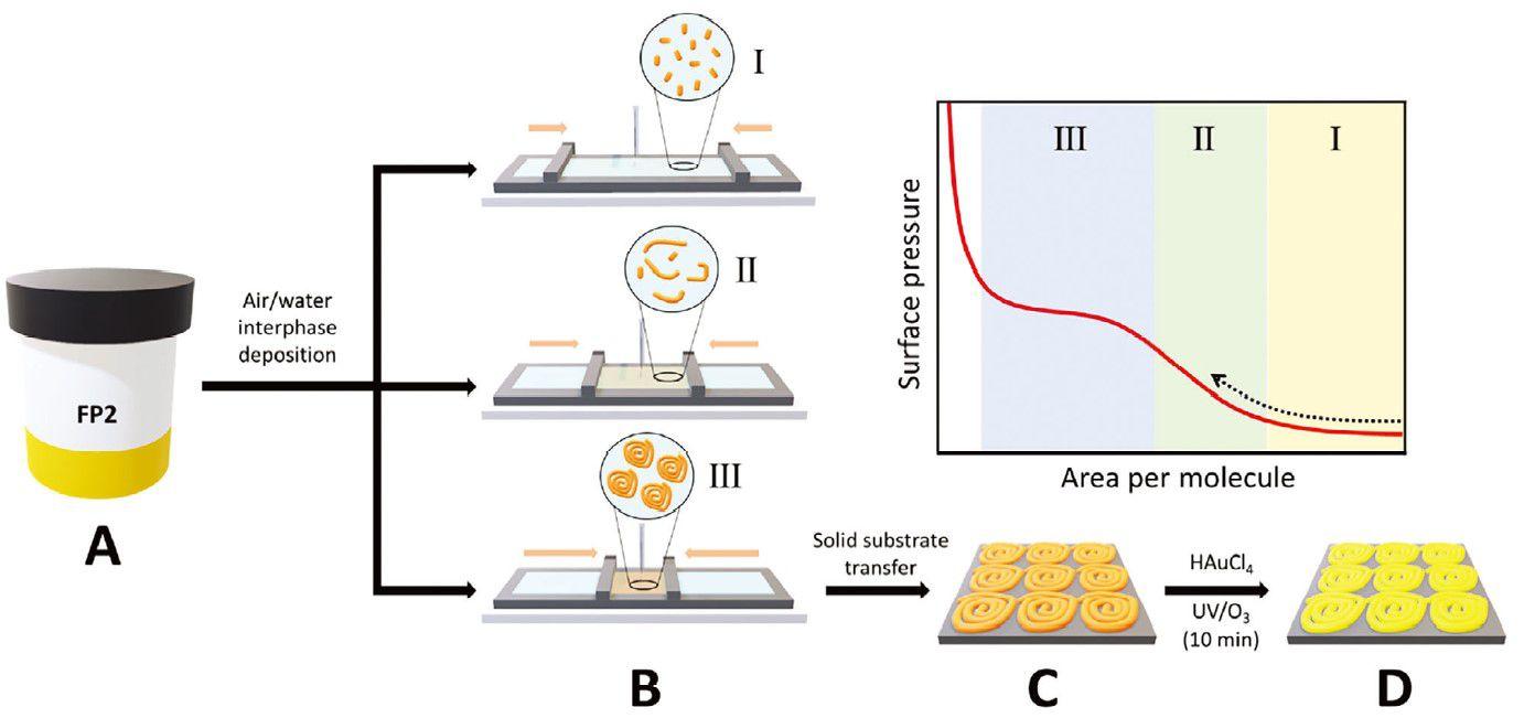 證明了病毒融合肽序列在朗繆爾槽內(nèi)從納米原纖維形成彈性螺旋狀結(jié)構(gòu)的卓越能力。此外通過(guò)控制空氣-水界面的壓縮力,獲得了具有特定曲率和纖維間距離的納米原纖維。單軸壓縮也證明了流體到固體的轉(zhuǎn)變,導(dǎo)致凝膠網(wǎng)絡(luò)的形成,如剪切流變學(xué)所證明的那樣。這里介紹的制造方法引入了單軸收縮方法,作為制造高度均勻的肽纖維單層并將其轉(zhuǎn)移到固體基質(zhì)上的穩(wěn)健而有效的方法。最后螺旋狀結(jié)構(gòu)用作制造金金屬?gòu)?fù)制品的模板。這種多技術(shù)方法不僅加深了對(duì)肽自組裝的理解,而且揭示了工程功能納米材料的新場(chǎng)景。