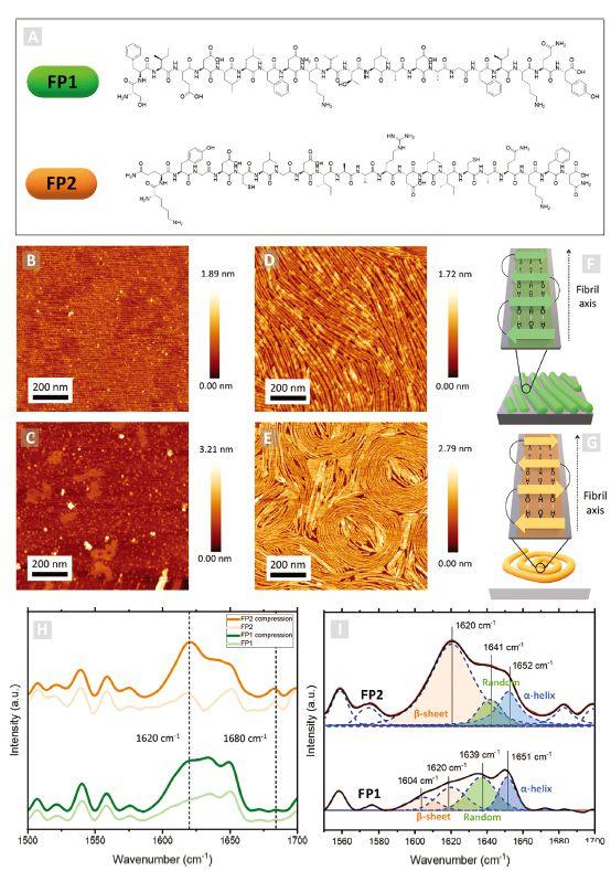 圖2、A)FP1和FP2肽的化學(xué)結(jié)構(gòu)。FP1(B和D)和FP2(C和E)肽LB膜的AFM顯微照片分別在無(wú)壓縮(B和C)和20 mN m-1(D和E)的情況下轉(zhuǎn)移到新鮮切割的云母基底上。F,G)導(dǎo)致纖維形成的肽β-折疊二級(jí)結(jié)構(gòu)的示意圖。H)在這項(xiàng)工作中研究的樣品的LDIR光譜。I)將酰胺I帶解卷積為其主要成分。