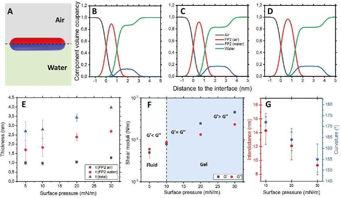 圖4、A)用于擬合NR數(shù)據(jù)的模型示意圖。B)10、C)20和D)30 mN m-1處界面的密度分布。E)通過(guò)NR獲得的纖維的總厚度。F)界面剪切流變測(cè)量。G)通過(guò)分析AFM圖像獲得纖維的間距和曲率。