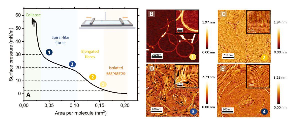 圖3、A)在空氣/水界面上鋪展的FP2肽的壓縮等溫線(xiàn)π–A以及在3、10、20和30 mN m?1下獲得的LB肽膜的AFM顯微照片(分別為B、C、D和E))。