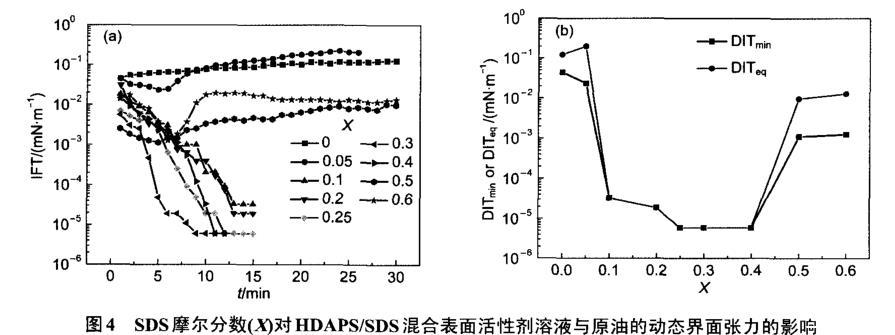 圖4 SDS摩爾分?jǐn)?shù)(X)對HDAPS/SDS混合表面活性劑溶液與原油的動態(tài)界面張力的影響