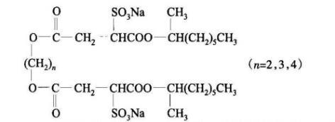 乙二醇雙子琥珀酸二仲辛酯磺酸鈉(GSS271)、1,3-丙二醇雙子琥珀酸二仲辛酯磺酸鈉(GSS371)、1,4-丁二醇雙子琥珀酸二仲辛酯磺酸鈉(GSS471)(結(jié)構(gòu)式如下,實驗室自制。提純后測定,表面張力曲線無最低點,說明不含高活性雜質(zhì)),實驗用水均為二次去離子水經(jīng)亞沸重蒸。