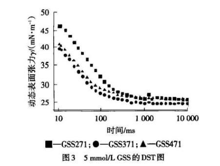 當(dāng)溶液濃度c為1 mmol/L(c<cmc)時,由圖2可知,表面活性劑GSS271、GSS371和GSS471均表現(xiàn)為典型的DST變化曲線,即開始時DST接近溶劑的表面張力,后隨時間延長先快速下降,下降至一定數(shù)值后降速緩慢,最后DST基本保持不變。因為吸附剛開始時GSS在新鮮的氣液界面吸附量很少,所以界面張力接近溶劑的表面張力,隨著時間的推移,GSS分子逐漸吸附在界面,氣液界面張力降低;隨著吸附的進行,界面逐步趨于飽和,吸附推動力減小,GSS分子在界面吸附速率下降,因而DST下降緩慢最后趨于介平衡。GSS分子在界面達到飽和后還需進一步吸附與定向排列,因而DST曲線中的介平衡張力較對應(yīng)濃度下的靜態(tài)表面張力大。當(dāng)溶液濃度為5 mmol/L時,由圖3僅觀察到DST快速下降區(qū)和介平衡區(qū)。因為濃度較高(c>cmc),開始時便有較多的表面活性劑分子被吸附到表面,所以DST低于溶劑表面張力。