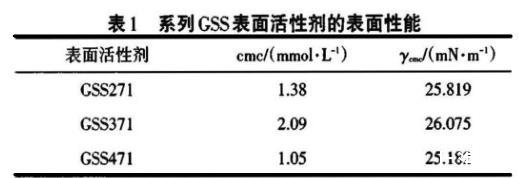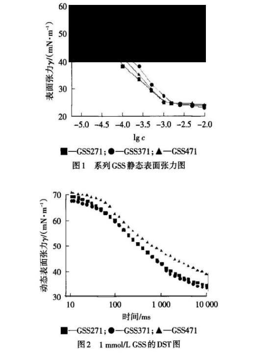 雙磺基琥珀酸酯磺酸鈉(簡稱GSS)通過柔性連接基將兩個傳統(tǒng)的琥珀酸酯鹽連接而成,連接基使GSS分子中兩個離子頭基間的靜電斥力大大削弱,同時加強了碳?xì)滏滈g的疏水結(jié)合力,使GSS具有比單鏈琥珀酸酯磺酸鹽更低的臨界表面張力。
