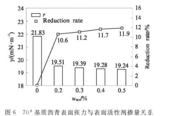使用改進差分毛細(xì)管法,得到不同表面活性劑摻量wW2下B+W2的表面張力值,見圖6.由圖6可見:未摻表面活性劑時,70#基質(zhì)瀝青表面張力為21.83mN/m,表面活性劑摻量為0.2%時B+W2的表面張力為19.51mN/m,表面張力顯著降低,降幅為10.6%;表面活性劑摻量在0.3%——0.5%,表面張力在19.24——19.39mN/m,與70#基質(zhì)瀝青相比,表面張力降幅趨緩,降低幅度為11.2%——11.9%.