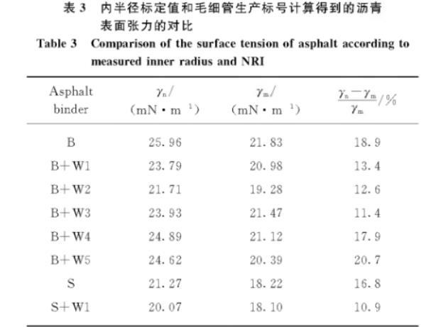 表3內(nèi)半徑標(biāo)定值和毛細(xì)管生產(chǎn)標(biāo)號計算得到的瀝青表面張力的對比