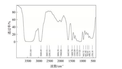 TPHS表面活性劑的紅外光譜譜圖如圖2所示。其中,3351 cm-1處為分子間氫鍵、羥基O—H的伸縮振動(dòng)峰;1356 cm-1處為羥基O—H的面內(nèi)彎曲振動(dòng)峰;2880 cm-1處為甲基C—H的伸縮振動(dòng)峰;1230和1117 cm-1處為磺酸鹽S=O鍵的不對(duì)稱伸縮振動(dòng)峰;696、762和841 cm-1處分別為苯環(huán)芳烴鄰位、間位、對(duì)位的C—H鍵的面外彎曲振動(dòng)峰;1460 cm-1處為苯環(huán)骨架C—C伸縮振動(dòng)峰;1960和2094 cm-1處為苯環(huán)上C—H的伸縮振動(dòng)吸收弱的倍頻譜,538 cm-1處為取代苯環(huán)的面外彎曲振動(dòng)峰,證明所合成的表面活性劑為目標(biāo)產(chǎn)物。