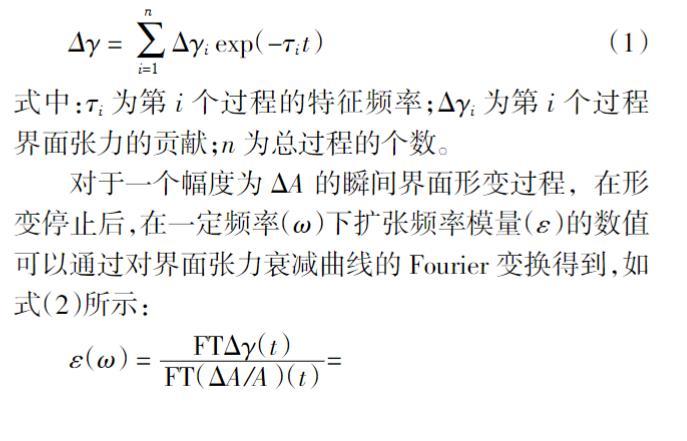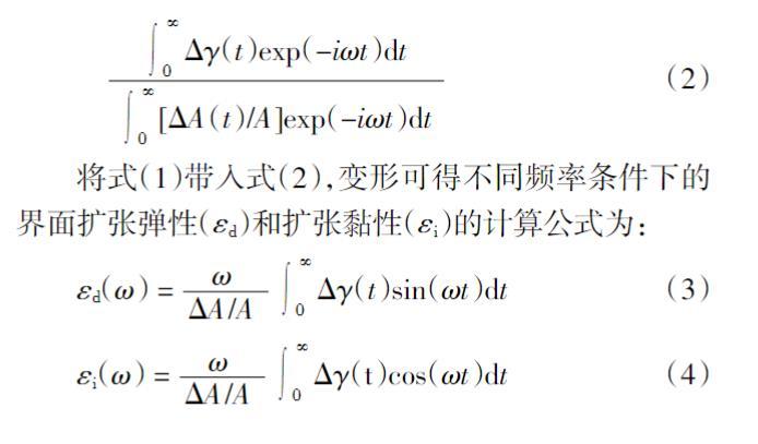 對(duì)于一個(gè)幅度為ΔA的瞬間界面形變過(guò)程,在形變停止后,在一定頻率(ω)下擴(kuò)張頻率模量(ε)的數(shù)值可以通過(guò)對(duì)界面張力衰減曲線(xiàn)的Fourier變換得到,如式(2)所示: