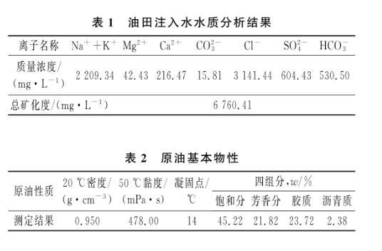 (1)主要材料。脂肪醇聚氧乙烯醚硫酸鈉、十二烷基苯磺酸鈉、十二烷基硫酸鈉,成都科龍化工試劑廠生產(chǎn);十六烷基二甲基甜菜堿、烷基糖苷APG1214,臨沂綠森化工有限公司生產(chǎn),上述藥品均為工業(yè)級。實驗用水為油田注入水,水質分析結果見表1;實驗用油為X油田原油,其基本物性見表2。
