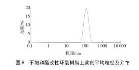 制備的不飽和酯改性環(huán)氧樹脂上漿劑乳液的性能測試結(jié)果見表5,粒徑及分布測試結(jié)果見圖5。