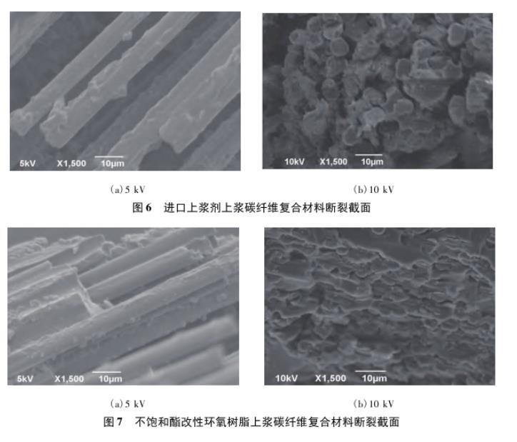 復(fù)合材料斷裂截面圖顯示,采用進(jìn)口上漿劑制備的碳纖維在部分區(qū)域未能有效吸附上漿劑組分,出現(xiàn)纖維的滑脫和粘連等不良現(xiàn)象。采用不飽和酯改性環(huán)氧樹脂上漿劑制備的碳纖維表面均勻涂覆上漿劑高分子,并與酚醛基體樹脂粘結(jié)成一體,纖維很難從樹脂中滑脫,界面結(jié)合性能良好。測試結(jié)果表明,不飽和酯改性環(huán)氧樹脂上漿劑能有效改善上漿碳纖維與不同基體樹脂的適用性,具有更好的通用性。