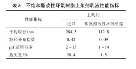 由表5結(jié)果可見:不飽和酯改性環(huán)氧樹脂上漿劑為微乳液,平均粒徑更小,離心沉淀量低,更易長時間儲存應(yīng)用;可在較寬的pH范圍內(nèi)保持穩(wěn)定,熱失重程度小,耐溫性高,可滿足各種不同復(fù)合材料樹脂基體高溫、中溫、低溫加工工藝的需求。