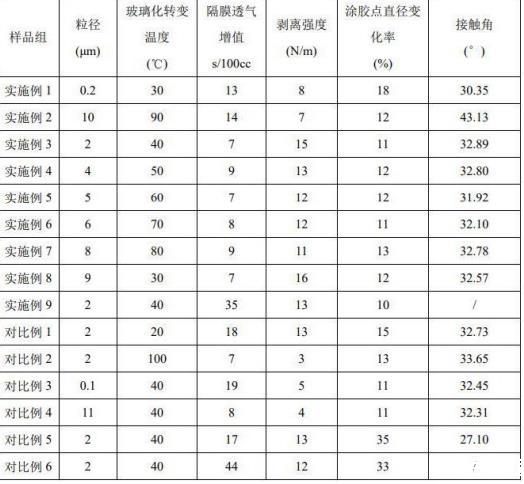 測(cè)試結(jié)果表明,當(dāng)膠液稀釋液表面張力在28mN/m以上時(shí),隔膜粘接劑組合物涂布并干燥后的膠點(diǎn)直徑變化率較小,當(dāng)表面張力太低時(shí),膠點(diǎn)直徑變化率較大,透氣增值變大。當(dāng)聚合物顆粒A粒徑在0.2-10μm,玻璃化轉(zhuǎn)變溫度在30-90℃范圍內(nèi)時(shí),隔膜同時(shí)具有較低的透氣增值以及更好的剝離強(qiáng)度。聚合物顆粒A粒徑太小時(shí),容易堵塞隔膜孔道造成透氣增值增大,并且剝離強(qiáng)度也較弱。聚合物顆粒A粒徑太大,聚合物顆粒A涂布后容易脫落,剝離強(qiáng)度降低。聚合物顆粒A玻璃化溫度太高,熱壓時(shí)無(wú)法軟化,剝離強(qiáng)度低;而玻璃化溫度太低則容易成膜,造成隔膜透氣增值變大。