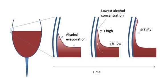 因此,這會在彎月面和葡萄酒與空氣間的平坦接觸表面之間形成濃度差,隨后將造成表面張力梯度(表面張力上大,下?。?,隨著時間推移,使彎月面沿著玻璃杯壁向上移動。