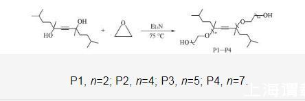4種表面活性劑的合成條件相同,以P1的合成為例。首先將450 g(1.77 mol)2,5,8,11-四甲基~6-十二炔~5,8-二醇加入到高壓反應釜中,用高純氮氣置換釜內(nèi)氣體3次;隨后加入3.65 g(0.036 mol)三乙胺,升溫至75℃后勻速通入316 g(7.18 mol)環(huán)氧乙烷,并持續(xù)反應3.5 h;反應完成后,將反應釜冷卻至室溫,打開反應釜閥門將殘余的環(huán)氧乙烷排放至尾氣吸收裝置,收集粗產(chǎn)物;通過旋轉(zhuǎn)蒸發(fā)儀除去粗產(chǎn)物中的三乙胺,得到739 g淡黃色液體,產(chǎn)率為96.5%.P2,P3和P4的合成步驟與表征見本文支持信息圖S1——S4.