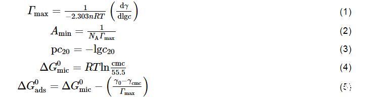 按下式計算表面活性劑在空氣/水界面處的飽和吸附量(Γmax,μmol/m2)、最小分子吸附面積(Amin,nm2)、表面活性效率(pc20)、標準膠束化自由能(ΔG0mic,kJ/mol)和標準吸附自由能(ΔG0ads,kJ/mol):
