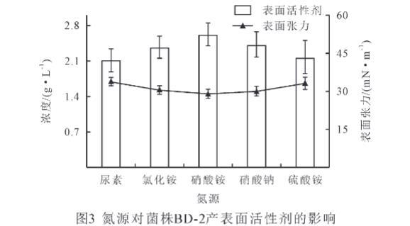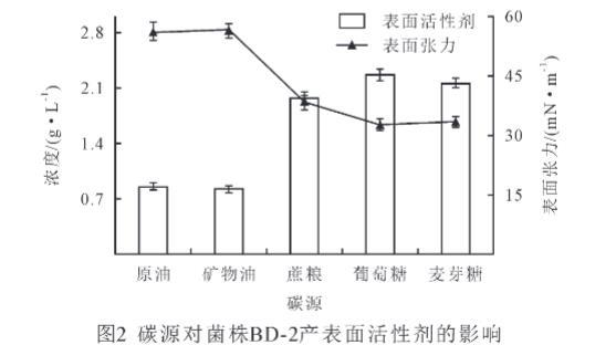 碳源對(duì)微生物的生長(zhǎng)和次生代謝產(chǎn)物的產(chǎn)生有重要的影響。由圖2可知,不同碳源對(duì)菌株BD-2產(chǎn)表面活性劑量的影響不同,本實(shí)驗(yàn)將原油、礦物油作為一類復(fù)雜碳源,葡萄糖、麥芽糖、蔗糖作為簡(jiǎn)單碳源,進(jìn)行對(duì)比分析發(fā)現(xiàn),以簡(jiǎn)單碳源作為底物時(shí),菌株BD-2產(chǎn)表面活性劑的量顯著高于復(fù)雜碳源(P<0.05),其產(chǎn)表面活性劑量大小依次為葡萄糖>麥芽糖>蔗糖>原油>礦物油。同時(shí)以簡(jiǎn)單碳源為底物時(shí),菌株BD-2能顯著降低發(fā)酵液表面張力(P<0.05),其發(fā)酵液表面張力大小依次為原油>礦物油>蔗糖>麥芽糖>葡萄糖。在簡(jiǎn)單碳源中,以葡萄糖為碳源時(shí),菌株BD-2產(chǎn)生的表面活性劑的量最高,為2.26 g/L,而表面張力最低,為32.7 mN/m。研究結(jié)果表明,簡(jiǎn)單碳源有利于菌株BD-2產(chǎn)表面活性劑。因此,選擇葡萄糖為菌株BD-2的碳源。