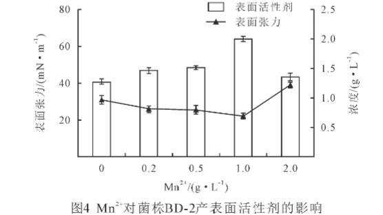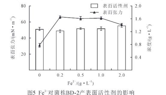 不同Mn2+、Fe2+濃度對(duì)菌株BD-2產(chǎn)表面活性劑的影響不同。由圖4可見,隨著Mn2+濃度的增加,表面活性劑量呈現(xiàn)先升高后降低的趨勢(shì),而表面張力先下降后升高。Mn2+濃度0.5~1 g/L,表面活性劑量明顯升高,在1 g/L時(shí),表面活性劑量最大,為2 g/L,而表面張力從30.9 mN/m下降到26.2 mN/m。在1%以后,表面活性劑量顯著下降(P<0.05),由2g/L下降到1.36 g/L,而表面張力顯著上升(P<0.05),由26.2 mN/m上升到39.2 mN/m。結(jié)果研究表明,菌株BD-2在Mn2+濃度為1 g/L的表面活性劑量最多,表面張力最小。因此,菌株BD-2的最適Mn2+濃度為1%。
