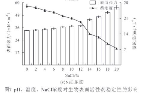 研究了石油降解菌BD-2產(chǎn)生的生物表面活性劑在不同pH、溫度和NaCl濃度下的穩(wěn)定性。如圖7(a)所示,在pH小于4時(shí),萘濃度顯著下降(P<0.05),發(fā)酵液的表面張力顯著上升(P<0.05)。當(dāng)pH為4~10時(shí),表面張力和萘濃度沒有顯著變化(P>0.05),當(dāng)pH為10~12時(shí),隨著pH的增加,發(fā)酵液中萘濃度下降,而表面張力此時(shí)上升,并且差異都顯著(P<0.05)。結(jié)果表明該菌產(chǎn)生的生物表面活性劑具有較好的耐酸堿能力。