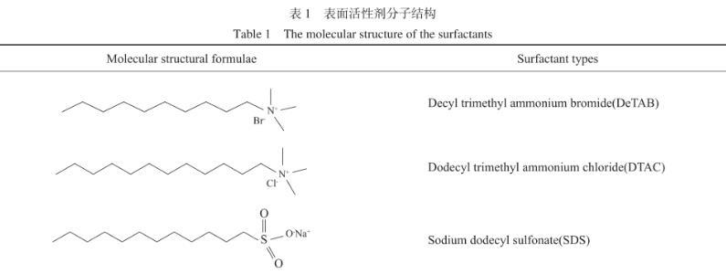 高純CO2:99.95%(φ),法國液化空氣集團(tuán);十二烷基三甲基氯化銨(DTAC)、十烷基三甲基溴化銨(DeTAB)、十二烷基磺酸鈉(SDS):含水1%(w),阿達(dá)瑪斯試劑有限公司。表面活性劑分子結(jié)構(gòu)見表1。實(shí)驗(yàn)用表面活性劑水溶液均為1.0%(w),實(shí)驗(yàn)用水為去離子水。