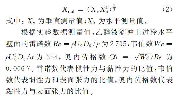 根據(jù)實(shí)驗(yàn)數(shù)據(jù)測(cè)量值,乙醇液滴沖擊過(guò)冷水平壁面的雷諾數(shù)Re=ρU0D0/μ為2795,韋伯?dāng)?shù)We=ρU20D0/σ為354,奧內(nèi)佐格數(shù)Oh=We/Re為0.0067。雷諾數(shù)代表慣性力與黏性力的比值,韋伯?dāng)?shù)代表慣性力和表面張力的比值,奧內(nèi)佐格數(shù)代表黏性力與表面張力的比值。