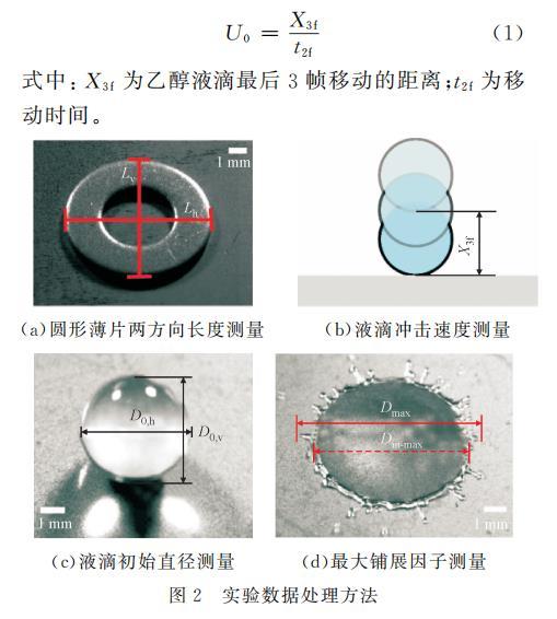式中:X3f為乙醇液滴最后3幀移動(dòng)的距離;t2f為移動(dòng)時(shí)間。(a)圓形薄片兩方向長(zhǎng)度測(cè)量(b)液滴沖擊速度測(cè)量(c)液滴初始直徑測(cè)量(d)最大鋪展因子測(cè)量圖2實(shí)驗(yàn)數(shù)據(jù)處理方法