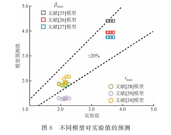 式中:tmax,pre和βmax,pre為使用各模型的最大鋪展時間和最大鋪展因子預(yù)測值;tmax,exp和βmax,exp為最大鋪展時間和最大鋪展因子實驗值。如圖8所示,不同公式的預(yù)測結(jié)果不同,對于最大鋪展因子,盡管不同學(xué)者提出的表達式對實驗結(jié)果的預(yù)測準確率均較好,單個數(shù)據(jù)點的偏差均在20%以內(nèi),然而由于表達式的限制,無法針對液滴沖擊不同水平壁面過冷度的實驗工況進行預(yù)測,存在一定缺陷。對于最大鋪展時間,Huang和Chen等人提出的表達式預(yù)測效果較差,Wildeman等提出的表達式預(yù)測效果較好,相對平均偏差為12.32%,但由于其表達式內(nèi)不包含水平壁面過冷度的影響因素,因而預(yù)測效果略差于Shang等提出的表達式,其相對平均偏差為6.05%。綜上所述,現(xiàn)有最大鋪展時間的表達式能較好預(yù)測乙醇液滴沖擊過冷水平壁面的鋪展動力學(xué)行為,但最大鋪展因子表達式仍需進一步探索。
