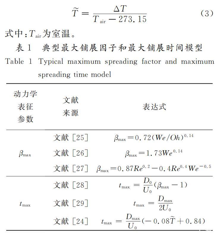 針對液滴沖擊水平壁面的最大鋪展因子和最大鋪展時間,眾多學(xué)者開展了一系列定量研究,以期探究液滴沖擊水平壁面的鋪展動力學(xué)行為定量表達式。