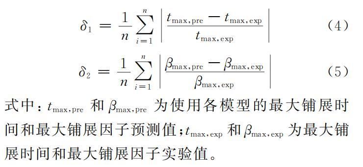 利用表1中的模型,對乙醇液滴沖擊過冷水平壁面的最大鋪展時間和最大鋪展因子進行預(yù)測,并采用相對平均偏差δ為評價指標,衡量不同公式的預(yù)測效果