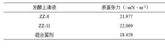 表面張力是洗油劑對原油洗脫能力的重要指標,數(shù)值越低、洗脫能力越強。測試結果顯示解淀粉芽孢桿菌(Bacillus amyloliquefaciens)ZZ-11和膠凍樣芽孢桿菌(Bacillus mucilaginosus)ZZ-8發(fā)酵上清液均能降低表面張力,混合菌劑發(fā)酵上清液的表面張力值更低。
