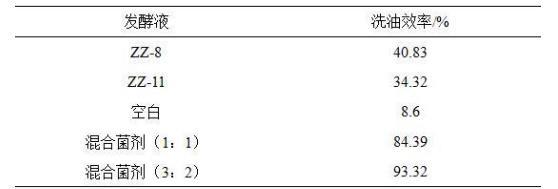 各組洗油效率測試結果如表3所示,解淀粉芽孢桿菌(Bacillusamyloliquefaciens)ZZ-11和膠凍樣芽孢桿菌(Bacillus mucilaginosus)ZZ-8發(fā)酵液均具有優(yōu)秀的洗油效率,本發(fā)明混合菌劑的洗油效率更為優(yōu)異,分別達到84.39%和93.32。