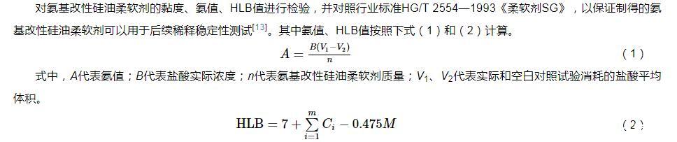對(duì)氨基改性硅油柔軟劑的黏度、氨值、HLB值進(jìn)行檢驗(yàn),并對(duì)照行業(yè)標(biāo)準(zhǔn)HG/T 2554—1993《柔軟劑SG》,以保證制得的氨基改性硅油柔軟劑可以用于后續(xù)稀釋穩(wěn)定性測(cè)試。其中氨值、HLB值按照下式(1)和(2)計(jì)算。