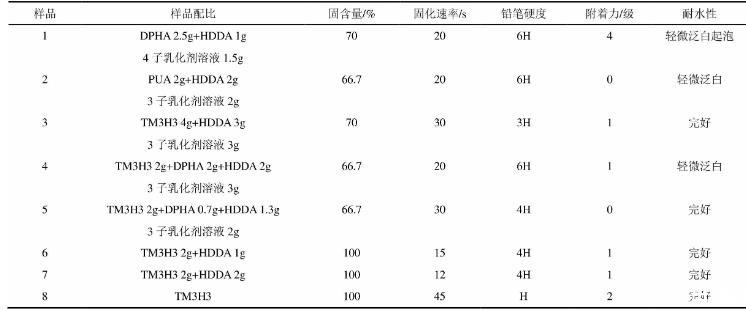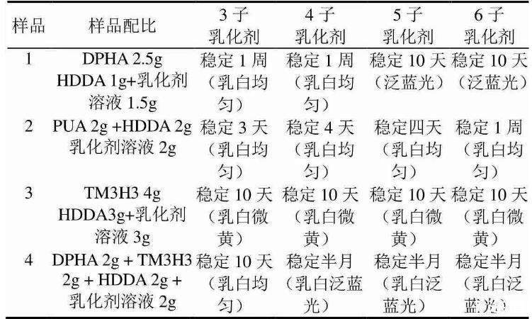 注:所用乳化劑溶液濃度均為0.06mol/L的鈉鹽溶液,以4%的1173引發(fā)光固化。