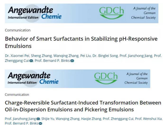 近期,江南大學(xué)蔣建中-崔正剛科研團(tuán)隊(duì)在新型智能表面活性劑設(shè)計(jì)開(kāi)發(fā)領(lǐng)域取得突破性研究進(jìn)展,連續(xù)在Angew.Chem.Int.Ed.上發(fā)表2篇研究論文:“Behavior of smart surfactants in stabilizing pH-responsive emulsions,Angew.Chem.Int.Ed.2021,60,5235-5239(通訊作者崔正剛教授和B.P.Binks教授)”和“Charge-reversible surfactant-induced transformation between oil-in-dispersion emulsions and Pickering emulsions,Angew.Chem.Int.Ed.2021,60,11793-11798(通訊作者蔣建中教授和B.P.Binks教授)”。