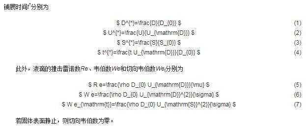 若一個(gè)具有初始球形當(dāng)量直徑D0以及初始面積S0的液滴在撞擊過程中經(jīng)過鋪展時(shí)間t后的鋪展直徑為D,鋪展面積為S,且此時(shí)鋪展線速度為U,則定義相應(yīng)的無量綱鋪展因子D*、無量綱鋪展速度U*、無量綱鋪展面積S*和無量綱鋪展時(shí)間t*分別為