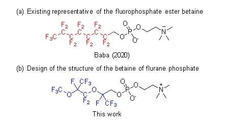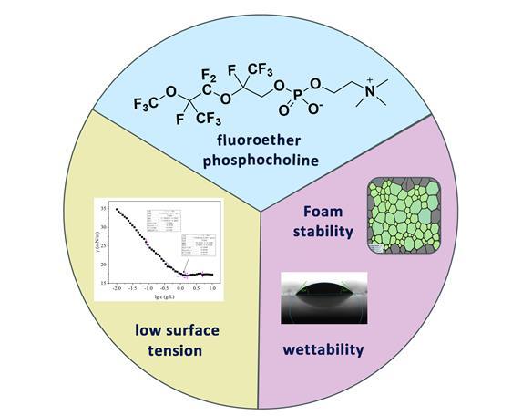 將氧原子引入到氟磷酸膽堿表面活性劑中,會對磷酸膽堿性能產(chǎn)生怎樣的影響呢?我們設計合成了一種新型氟醚磷酸膽堿表面活性劑(圖1b),考慮到長氟碳鏈和長氟醚鏈段具有生物累積性,我們選用了氟碳鏈為6的短鏈結(jié)構(gòu),并向其中插入兩個氧原子,將新化合物與一個鏈長相近的氟磷酸膽堿表面活性劑進行對比,結(jié)果表明新型氟醚磷酸膽堿表面活性更佳。我們進一步探索了新氟醚磷酸膽堿的泡沫性能與潤濕性能,結(jié)果表明氟醚磷酸膽堿的穩(wěn)泡性好、可在聚四氟乙烯(PTFE)上潤濕,是一類具有良好應用前景的表面活性劑。