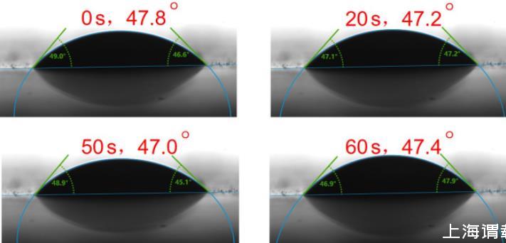 圖61 g/L的C72-MPB水溶液在PTFE上不同時(shí)間的潤(rùn)濕狀態(tài)