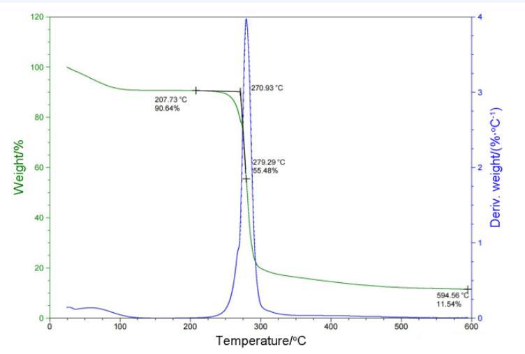 TGA圖中可以看到樣品的失重主要集中在100℃以下和250℃到300℃,DSC圖中可以看出樣品的吸熱主要有三個(gè)區(qū)域,分別在100℃以下,140——170℃和260——300℃。結(jié)合TGA和DCS來看,在溫度100℃以下部分是少量溶劑及產(chǎn)物中的水蒸發(fā),溫度達(dá)到140℃時(shí),DSC中有吸熱峰,但TGA曲線沒有變化,說明產(chǎn)物發(fā)生相變,從固體轉(zhuǎn)變?yōu)橐后w,直到250℃左右開始失重,最終仍有11.54%固體剩余證明一定存在分解現(xiàn)象并產(chǎn)生固體產(chǎn)物,結(jié)合DSC圖中有多個(gè)吸熱峰來看推測(cè)是產(chǎn)物有多步分解,也不排除存在部分的汽化失重的可能性。