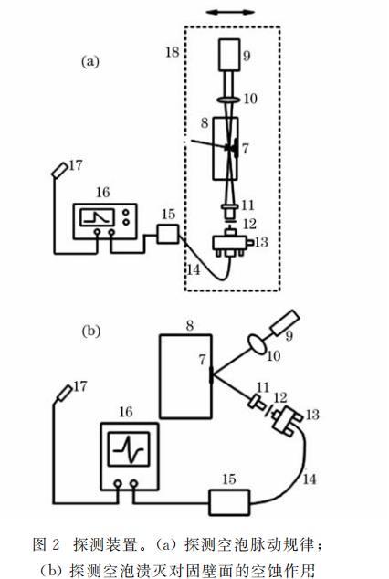 圖2探測裝置。(a)探測空泡脈動規(guī)律;(b)探測空泡潰滅對固壁面的空蝕作用