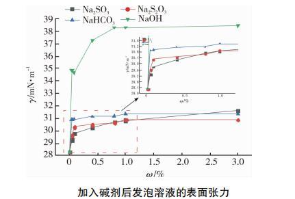 圖4是不同質(zhì)量分?jǐn)?shù)堿劑發(fā)泡液表面張力的測試結(jié)果。強堿NaOH使發(fā)泡液表面張力明顯提高,在NaOH質(zhì)量分?jǐn)?shù)3%時達(dá)到最大值38.3mN/m,隨后發(fā)泡液表面張力值保持穩(wěn)定,不受NaOH含量變化影響。說明NaOH濃度升高時OH-過多,造成圖4加入堿劑后發(fā)泡溶液的表面張力表面活性物質(zhì)停留于溶液表面,阻礙了OH-與更多表面活性物質(zhì)的反應(yīng)機會,溶液表面張力不再受影響。圖4中弱堿Na2S2O3,NaHCO3變化規(guī)律與NaOH相似,低濃度時發(fā)泡液表面張力激增,達(dá)到質(zhì)量分?jǐn)?shù)0.8%之后,表面張力值增幅減緩。NaOH加入使發(fā)泡液表面張力增加了35.7%,而其他3種弱堿無機鹽在濃度最大時(質(zhì)量分?jǐn)?shù)3%)僅增加約10%.與強堿劑相比,弱堿劑對溶液表面張力影響較小。