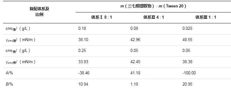 根據(jù)Rosen相分離模型,當二元混合表面活性劑復配體系在吸附達到平衡時,溶液相與表面相的化學勢能相等(μ溶=μ表),從吸附達到飽和時溶液相與表面相、膠束相的化學勢能相等(μ溶=μ表=μ膠)出發(fā),推導出復配增效的最佳質(zhì)量比值約等于各單一組分臨界膠束濃度的比值,即m1∶m2≈cmc1∶cmc2。根據(jù)之前的實驗結(jié)果,近似地將三七根提取物與Tween 20的復配質(zhì)量比定為4∶1。