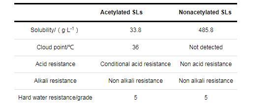 乙?;疭Ls和去乙?;疭Ls的溶解性、濁點(diǎn)和耐酸堿性如表3所示,可以看出,去乙?;疭Ls在水中的溶解度達(dá)到485.8 g/L,較乙?;疭Ls提高了14倍以上。這是由于去乙?;疭Ls中含有豐富的親水羥基,能夠與水分子形成穩(wěn)定的氫鍵。乙?;疭Ls濁點(diǎn)為36℃,可能限制其在高溫環(huán)境中的應(yīng)用;去乙?;疭Ls則無明顯濁點(diǎn),這是由于其組分中自由酸性和bola型SLs占絕對優(yōu)勢,這2類糖脂組分的分子轉(zhuǎn)動自由度高,使其不易結(jié)晶。另外,乙?;碧侵瑸橛袟l件的耐酸級,但是為非耐堿級;去乙酰化SLs則為非耐酸堿級,這可能是由于SLs的分子含有的β-糖苷鍵或羧酸基團(tuán)容易在酸堿條件下發(fā)生水解。2類SLs均具有良好的抗硬水性能,達(dá)到最高級5級。