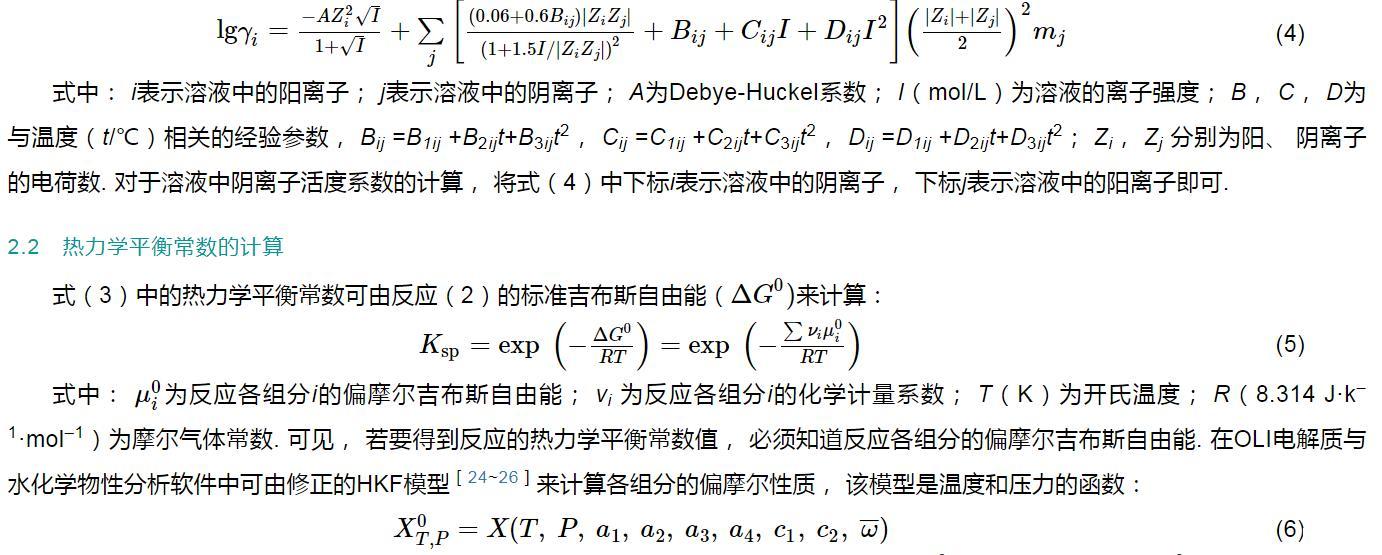 因此,式(3)中離子的活度系數(shù)可由OLI電解質(zhì)與水化學(xué)物性分析軟件[20]內(nèi)嵌的Bromley-Zemaitis方程[22,23]來計算: