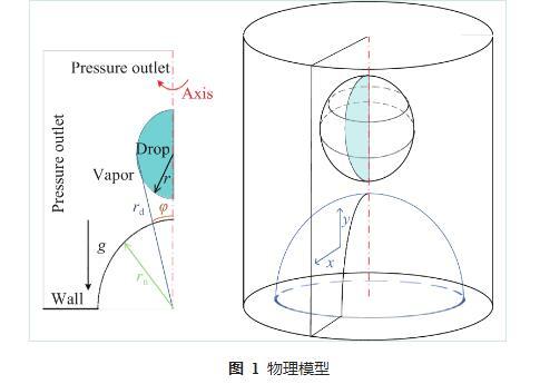 雖然,很多學(xué)者對Leidenfrost現(xiàn)象進行了一定研究,但是大部分研究成果聚焦于高溫平面上的液滴動力學(xué)與傳熱特性,而非平面上Leidenfrost現(xiàn)象的研究非常有限。但是,液滴撞擊高溫曲面廣泛存在于電子工程、機械工程、動力工程、化學(xué)工程等領(lǐng)域。如液滴撞擊高溫球面,常見于流化催化裂化和流化焦化等工藝,這一過程影響著多種過程系統(tǒng)的性能,尤其是對于生產(chǎn)更有價值的汽車燃料具有重要意義。鑒于此,本文進一步探究液滴與高溫球面撞擊過程中液滴的Leidenfrost現(xiàn)象,采用數(shù)值模擬方法進行研究,使用Fluent軟件構(gòu)建了二維軸對稱數(shù)值模型,采用VOF模型及Lee模型,分析液滴撞擊高溫球面的動力學(xué)特性與傳熱特性,探討Leidenfrost現(xiàn)象的機理及各因素的影響規(guī)律。