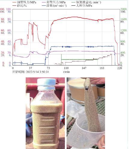 DK**-**24井斜深4461 m,地層溫度110℃左右,水平段總長度1300 m,鉆遇率84.1%,目的層馬五5段鉆遇儲層厚度25 m左右,該井設計分段18段,施工排量8~12 m3/min,采用前置酸液+高減阻強攜砂壓裂液+液氮伴注按照“先造縫、后成網(wǎng)”+“控黏增砂”的模式進行體積加砂壓裂施工,控制高黏液0.8%~1.0%SRY-1、中黏液0.5%~0.6%SRY-1、低黏液0.2%~0.3%SRY-1,多數(shù)段加砂施工順利,其中第4段施工排量10~10.5 m3/min,一般施工壓力79~87 MPa,最高砂比20%,壓裂液用液量1314.7 m3(其中高黏液415 m3、中黏液776.7 m3、低黏液123 m3),加砂量91.6 m3(加砂完成率101.8%),施工曲線及攜砂液靜態(tài)懸砂情況見圖8所示。