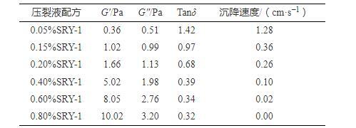 測試表明:隨SRY-1濃度的增加,壓裂液彈性模量G′不斷增大,Tanδ不斷減小,并且SRY-1超過CAC1(0.18%)后,增大和減小的趨勢更明顯。從壓裂液微觀作用機理分析,優(yōu)良的黏彈特性建立在CAC之上,依靠分子鏈間多重共價鍵交聯(lián)作用來形成高強度空間網(wǎng)絡結構,才能在壓裂液懸浮、攜帶支撐劑能力上發(fā)揮獨特優(yōu)勢。為此,進一步測試了40/70支撐劑在壓裂液中的沉降速度,結合壓裂液G′、G″、Tanδ與沉降速度進行關聯(lián)分析,如表5所示。