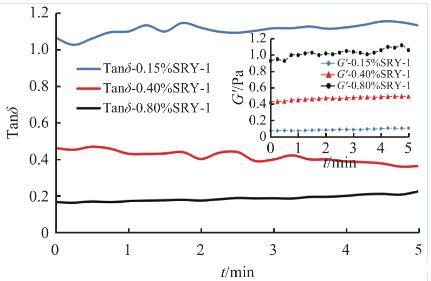 黏彈性是指流體對施加外力的響應,表現(xiàn)為黏性和彈性雙重特性,通常用G′表征彈性模量,G″表征黏性模量,而G″與G′的比值記作Tanδ,用于表征流體黏彈性的強弱:隨Tanδ由大到小變化,流體黏彈特性越明顯,Tanδ>1時,流體流動性強,Tanδ<1時,流體結構性強。對0.15%、0.4%、0.8%SRY-1的壓裂液進行了黏彈性測試(利用RS6000流變儀錐板測試系統(tǒng)進行定頻率定應力掃描實驗,測試得到的彈性模量G′、Tanδ變化情況見圖6所示。