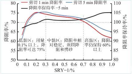 分別測試了不同SRY-1濃度下剪切1 min和循環(huán)剪切5 min后的降阻率,結果如圖4所示,從曲線可以看出,壓裂液降阻率最高可達75%以上,即使是高黏液降阻率也保持在60%以上;隨SRY-1濃度的增加呈先快速增加,再緩慢下降,再到較快下降的3個階段:當SRY-1濃度低于CAC1(0.18%)時,隨濃度的增加,壓裂液由分子內(nèi)多重共價鍵作用逐步向分子間共價鍵物理交聯(lián)轉變,并在剪切作用下增加分子間接觸機會,促進空間網(wǎng)絡結構形成,吸收部分湍流渦流能量,顯著減小湍流能量耗散,從而表現(xiàn)出降阻率快速增加的趨勢;當SRY-1濃度在CAC2(0.4%)附近時,壓裂液空間網(wǎng)絡結構在剪切作用下逐漸形成并加強,彈性增加,吸收并儲存湍流能量的能力加強,所以即使在壓裂液黏度增加較快的情況下,壓裂液降阻率保持相對穩(wěn)定,在現(xiàn)場施工中,隨排量的增大,湍流現(xiàn)象更加嚴重,結構流體儲存并轉換能量的作用更明顯,降阻性能會比室內(nèi)測試更突出;當SRY-1濃度繼續(xù)增大,壓裂液黏性急劇增加,流動的能量損耗也隨之顯著增大,從而導致降阻率下降較快。